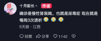 在评论区里,“十月船长”补充道:“确诊是慢性肾衰竭,也就是尿毒症,现在就是每周3次透析。”