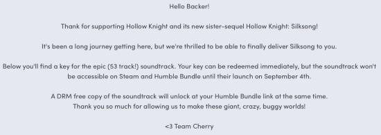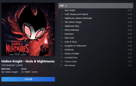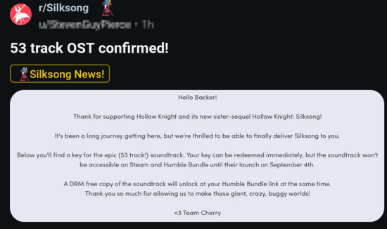 根据推特博主@daily silksong news的消息称,有众筹玩家在近日收到来自team cherry官方的邮件,确认《丝之歌》的游戏原声集中将包含53首曲目!
