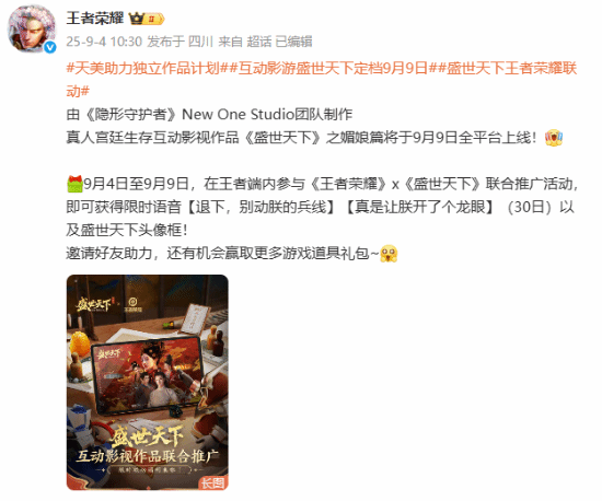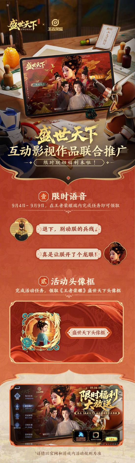 今日,《王者荣耀》官微宣布,9月4日至9月9日,在王者端内参与《王者荣耀》x《盛世天下》联合推广活动,即可获得限时语音【退下,别动朕的兵线】【真是让朕开了个龙眼】(30日)以及盛世天下头像框。