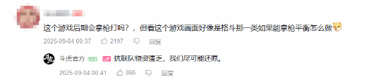 鉴于演示里仅公开了主角近战的情节,有玩家询问道:“这个游戏后期会拿枪打吗?单看这个游戏画面好像是格斗那一类,如果能拿枪的话,平衡怎么做?”《斗虎》官方表示:“ 抗联队物资匮乏,我们尽可能还原。”