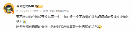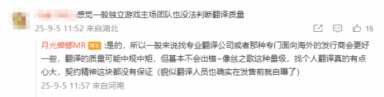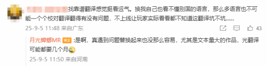 在评论区里,有玩家认为找靠谱的翻译需要运气,“月光蟑螂mr”说道:“是啊,真遇到问题替换起来也没那么容易,尤其是文本量大的作品,光翻译可能都要几个月。”并认为如果游戏需要在海外市场上市的话,就应该寻找专业的翻译公司或者专门面向海外的发行商,个人翻译不是很靠谱。