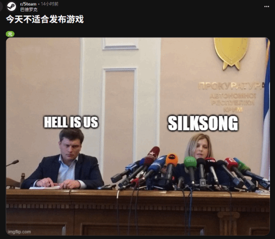 当然,也有游戏不惧竞争。与《丝之歌》同一天上线的虚幻5类魂新作《地狱即我们》,虽然在steam上获得了90%的好评率,也收获了一些积极评价,但热度完全无法与《丝之歌》相比。《地狱即我们》峰值在线人数不足四千,而《丝之歌》已突破53万。有玩家为《地狱即我们》制作梗图,心疼其风头已完全被《丝之歌》抢走。