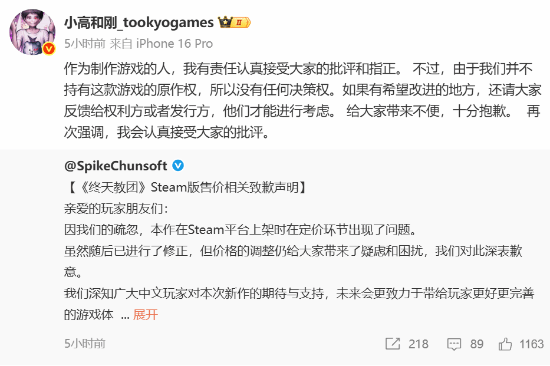 “作为制作游戏的人,我有责任认真接受大家的批评和指正。 不过,由于我们并不持有这款游戏的原作权,所以没有任何决策权。如果有希望改进的地方,还请大家反馈给权利方或者发行方,他们才能进行考虑。 给大家带来不便,十分抱歉。 再次强调,我会认真接受大家的批评。”