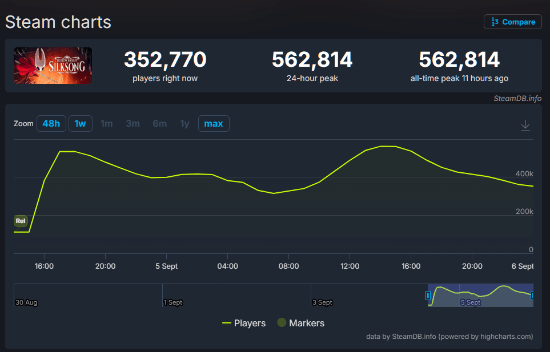 根据steamdb数据显示,截止至发稿时,《丝之歌》在steam平台的在线人数峰值再创新高,现已超越56万人!考虑到这还是周五晚上的数据,相信这一数字有望继续提升!