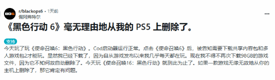 帖主表示,”在今天想要玩《黑色行动6》时,我的cod启动器运行是正常的,但是在运行《黑色行动6》的时候却被意外告知需要下载其他内容。可我已经下载了,因为从游戏发布后我每天都在玩。现在我不得不重新下载98gb的游戏文件,因为它莫名其妙被自动删除了。今天只好不玩了,如果一款游戏能无缘无故地从你的主机上删除,这里面绝对有问题。