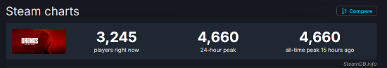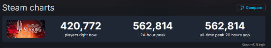 日前,外媒playground将这两款游戏在steam平台的在线峰值人数进行了对比,发现《空洞骑士:丝之歌》的在线峰值人数为562814人,《时间旅者:重生曙光》的在线峰值人数为4660人,并称二者的数量相差122倍。