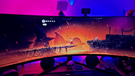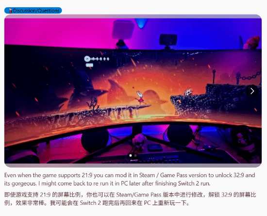 在reddit论坛,有国外玩家分享了自己用32:9带鱼屏游玩《丝之歌》的游戏截图,超大的视距让游戏视野更加清晰。