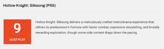 外媒noisypixel发布了《空洞骑士:丝之歌》的媒体评测文章,给出了9分的高分。