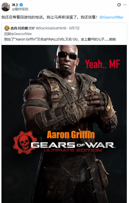 9月6日,说唱歌手ice-t回复了推特用户jack torrance237 发的一条帖子,该帖子是关于ice-t饰演的《战争机器》角色格里芬的,他回复称:“我可还在等着重返游戏的通知呢。该让主角马可斯滚蛋了,我还活着呢!”
