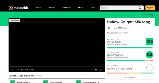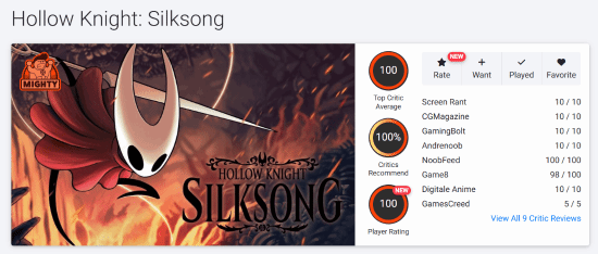 值得一提的是,不只是m站,《空洞骑士:丝之歌》在opencritic上同样获得了100分满分!这也是该平台唯一一款满分的游戏。