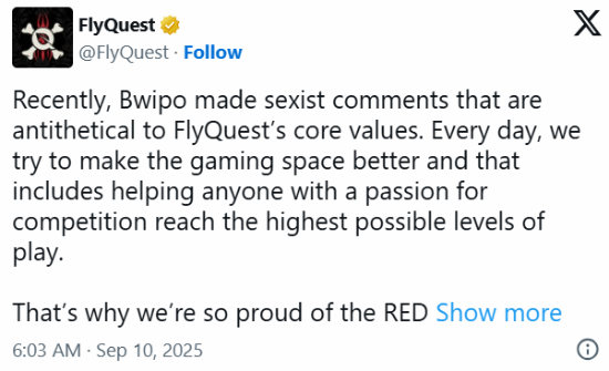 “bwipo近日的性别歧视言论与flyquest的核心价值观背道而驰。任何可能令女性对追逐电竞梦想感到气馁的言论都会损害行业的未来,我们对此极为重视。”