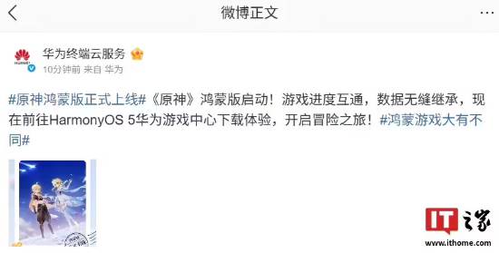 华为终端官方宣布,《原神》鸿蒙版游戏进度互通,数据无缝继承。玩家可前往 harmonyos 5 华为游戏中心下载体验。