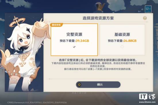 玩家可选择“完整资源”和“基础资源”两种方案下载。其中完整资源预估下载量 39.34gb(最佳体验)、基础资源预估下载量 26.88gb。