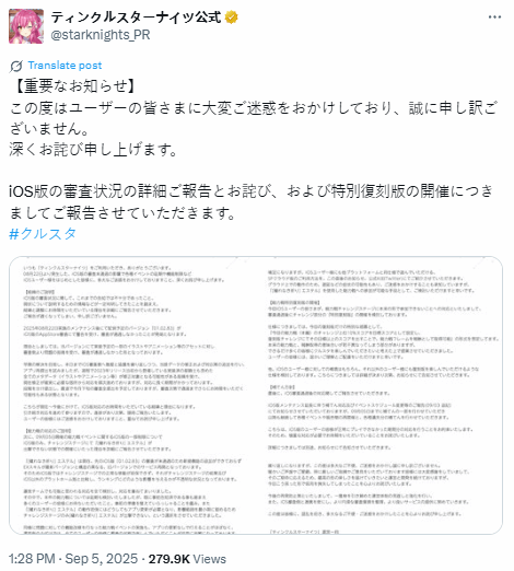 9月5日,日本抽卡游戏《闪耀之星骑士》官方透露游戏被app store拒绝更新,要求更改游戏内大量素材,app store给出的原因则是游戏内图片和动图未能通过平台审核。