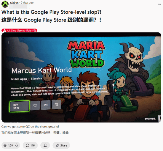 不过有趣的是,这款游戏虽然名字写着是《马库斯赛车:世界》,但其封面却写着《马里亚赛车:世界》。在曝光这款游戏的帖子下面,不少玩家也纷纷吐槽讽刺表达不满。