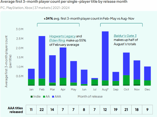 数据显示,2月和8月发布的游戏在三个月内平均玩家数量上表现最为突出。其中,2月以约250万玩家的平均数量位居第二,其中55%的玩家数来自《艾尔登法环》和《霍格沃茨之遗》。而8月发行的游戏在前三个月平均吸引了近300万玩家,这一成绩很大程度上得益于《博德之门3》的成功。若排除该游戏,平均值则降至约200万人。