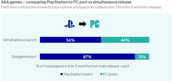 多平台发布分析揭示了不同的受众分布模式。对于最初在playstation上发布随后移植到pc的3a游戏,若采用分段式更新,则移植后前三个月的pc玩家占比平均为总玩家数的13%。而在同步发布的情况下,分布更为均衡:playstation占56%,pc占44%。