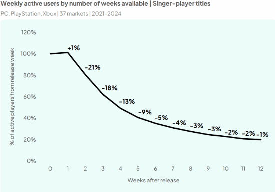 对于独立游戏而言,若它们同步登陆pc与playstation平台,前三个月内平均61%的玩家群体选择pc版本。而当游戏先在pc端发布,随后移植至playstation时,pc玩家占比则攀升至89%。newzoo还指出,所分析游戏存在用户快速流失的现象。平均而言,在发布后的第二周,活跃用户数量较首发周下降21%,这表明玩家的兴趣变化极为迅速。