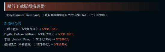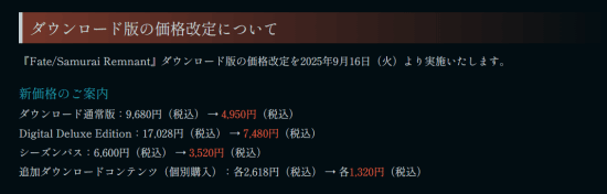 9月11日,光荣特库摩的动作类rpg游戏《fate/samurai remnant》(m站81分)宣布将于9月16日起下调价格,且作为treasure box特典所发放的下载内容追加服装幻想灵衣“宫本伊织”与幻想灵衣“saber”,也计划于9月16日起开放免费发布,一起来看下价格。值得一提的是,《fate/samurai remnant》现已加入9月ps 二三档会免。