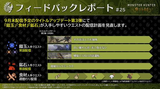 卡普空宣布,《怪物猎人:荒野》第三弹大更新将调整部分活动任务,目的是让玩家更容易获得铠玉、食材和矿石素材。有调整的任务如下: