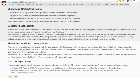 而在海外的社区讨论版上,更是有不少在现场试玩过《山外山》的玩家给出了正面反馈——一位撰写长评的玩家表示,这款游戏的青铜时代东方幻想背景令人着迷,动态的世界系统和环境演化非常真实,高交互高自由度且符合物理直觉的玩法非常有趣,《山外山》展现出了令人印象深刻的潜力,其未来相当值得期待。
