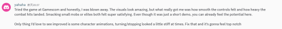 也有玩家认为,这款游戏融合了《幽灵公主》的美术与《塞尔达传说:旷野之息》的理念设计,打造出了体量庞大且迷人的生动世界,同时也针对现场试玩时遇到的一些缺憾(如目前的生存系统较为粗糙,缺乏饥饿、口渴条等设计)给出了意见反馈。