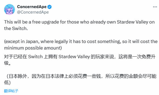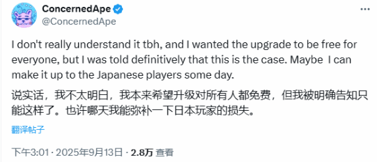 concernedape表示:“我本想全球免费升级,但日本市场有明确规定。或许未来我能为日本玩家提供其他补偿。”