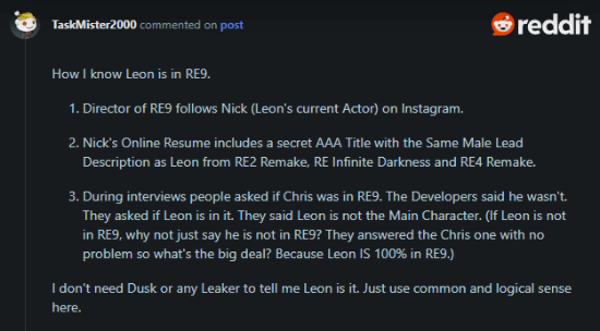 与此同时,reddit上也有玩家进行了推测:他们发现《生化危机9》的导演关注了里昂配音演员 nick apostolides 的 instagram,而后者的履历中也确实出现了一款“神秘3a项目”,人物描述与里昂吻合。