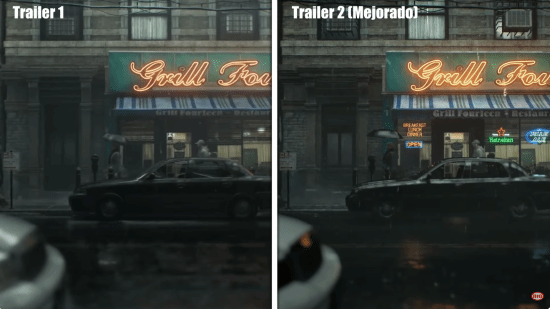 相较于上传到任天堂频道的预告片,在美任直播中播放的预告片似乎更高级,部分细节有所改进。比如雨水、头发等细节存在差异,直播中展示的预告更精致一些。