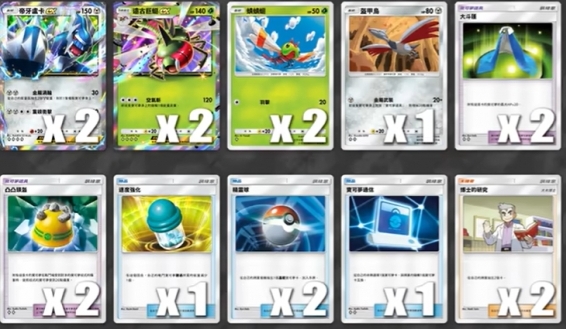 必备物品:精灵球携带 2 张,用于快速检索宝可梦,在前期尽快找到帝牙卢卡 ex、蜻蜻蜓等核心卡牌,确保卡组顺利展开;大斗篷 2 张,为宝可梦提供防御加成,特别是装备给盔甲鸟时,能大幅提升其生存能力与前期压制力。
