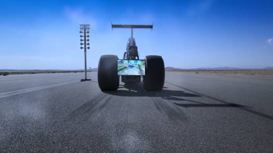 而另一边,后面挂着《索尼克赛车 交叉世界》屏幕的流线型赛车则风驰电掣,转瞬之间就只剩尾气了。