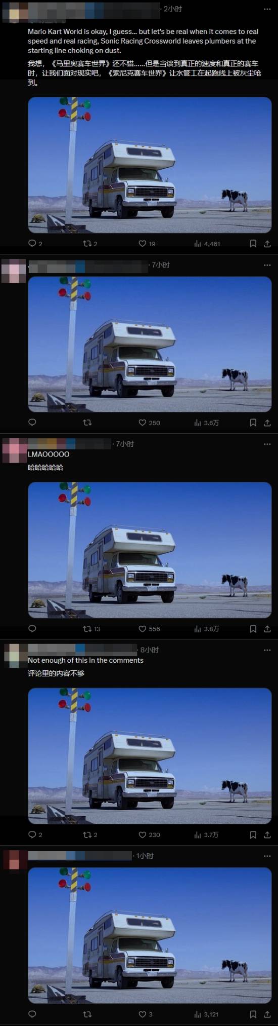 据automaton报道,世嘉的这则广告已经成功挑起了一场“粉丝大战”。目前在任天堂官博《马里奥赛车:世界》相关内容的评论区,除了零星的调侃,剩下的内容几乎已经被相关的梗图塞满了。