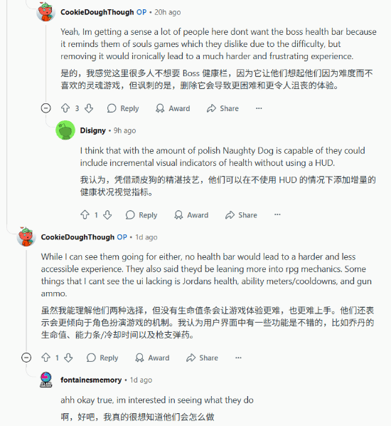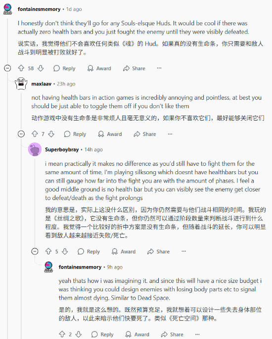 有玩家表示自己不喜欢任何类魂的ui设置,更不喜欢boss血条的设计。当然也有玩家表示反对。随后也有理性的玩家表示,二者实际上没有区别,与其设计一个可开关的血条显示,不如将boss设计成阶段性的,每当战斗进行到下一阶段,玩家能够明显看到(如boss盔甲损坏、部位失去等)变化来确定自己是否即将取胜。