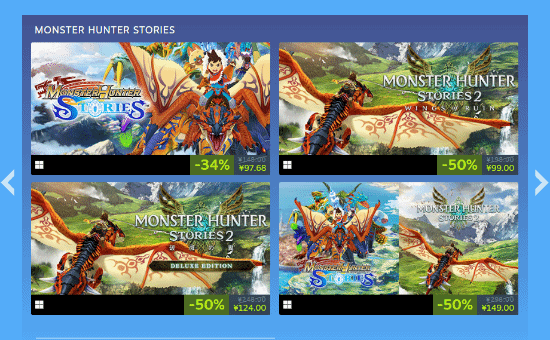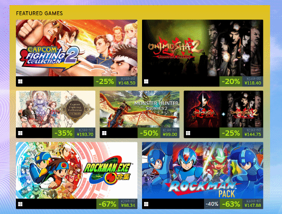 本次活动主要含《鬼武者2》首促8折,《卡普空格斗合集2》首促75折,《洛克人exe合集》33折,《怪物猎人物语》5折等游戏作品,优惠不容错过!