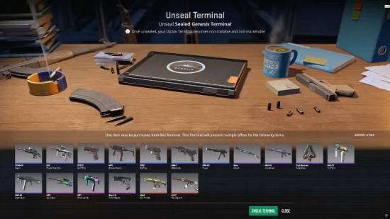 根据官方介绍,玩家每周可通过genesis uplink terminal获得一次免费机会。开启后,系统会在3天内依次展示一系列武器皮肤,玩家只能逐一选择接受或拒绝,一旦放弃便无法回头。然而,与常见的随机箱不同,这些皮肤并不是直接赠送,而是附带价格,玩家需要支付相应金额才能真正解锁。价格区间从0.30美元的普通皮肤,到接近1600美元的稀有物品不等。