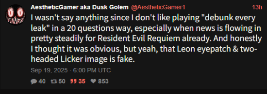 此外,网上还流传着一张据称是里昂在《生化危机9》中形象的图片。但dusk golem认为这是张假图片,他在推特互动中提到:“我本来不想说太多,尤其现在已经有很多关于《生化危机9》的情报在流传了。老实说,我以为大家都看得出来——是的,那个里昂戴眼罩的图是假的。”