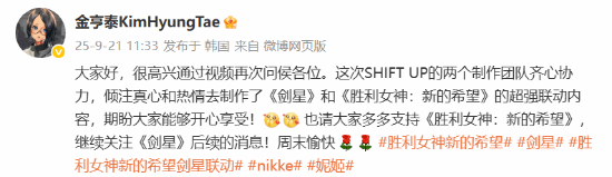 金亨泰转发联动寄语并配文:“大家好,很高兴通过视频再次问侯各位。这次shift up的两个制作团队齐心协力,倾注真心和热情去制作了《剑星》和《胜利女神:新的希望》的超强联动内容,期盼大家能够开心享受!也请大家多多支持《胜利女神:新的希望》,继续关注《剑星》后续的消息!周末愉快”