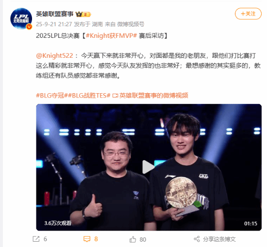 在赛后采访环节,knight选手表示:“今天赢下来就非常开心,对面都是我的老朋友,跟他们打比赛打这么精彩就非常开心,感觉今天队友发挥的也非常好;最想感谢的其实挺多的,教练组还有队员感觉都非常感谢。”