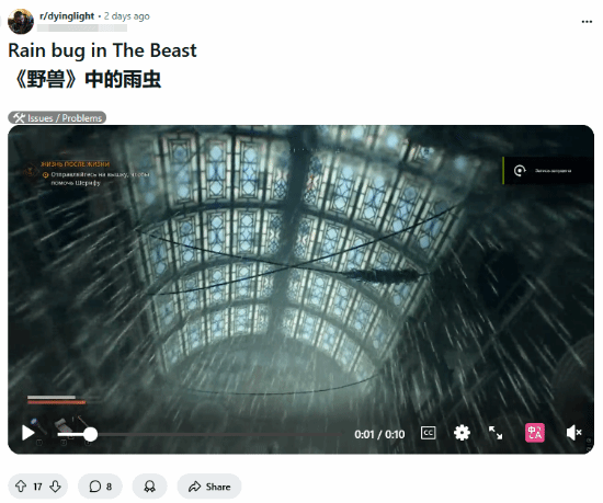 据一些玩家反馈,游戏出现了“室内下雨”和“昼夜颠倒”这种影响游戏体验的bug。
