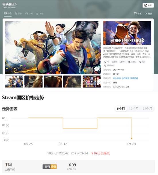 其中,格斗游戏《街头霸王6》迎来-50%新史低,目前仅需99元!