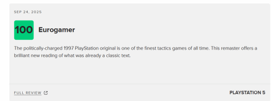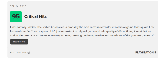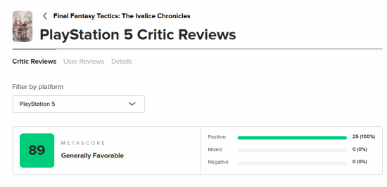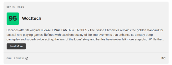 截止至发稿时,本作媒体评分已全面解禁!m站收录了25条ps5平台的媒体评测,均分89分,好评率100%!此外还有5条评测来自pc平台,均分为90分,好评率同样为100%!