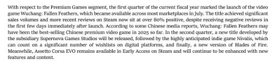 “在高端游戏的业务板块,我们在本财年第一季度见证了游戏《明末:渊虚之羽》的发行,该作品于7月登陆各大主流游戏商店。尽管发售初期遭遇负面评价,但本作最终实现了可观的销量,且近期在steam平台的好评率已经突破80%。据部分中国媒体报道,《明末:渊虚之羽》很可能成为2025年迄今销量最高的中国国产买断制游戏。”digital bros表示。
