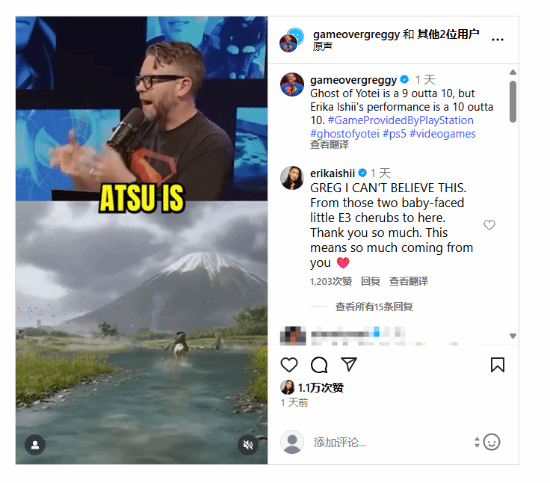 距离游戏发售还有数日,知名脱口秀博主@gameovergreggy日前在instagram发文,对饰演游戏主角“笃”的演员erika ishii进行了评价,认为erika ishii的演技可以说是10分满分。对此,erika ishii非常激动的回应道:“我简直不敢相信!能得到你这样的认可,对我而言意义非凡。”在评论区里,更多玩家对erika ishii进行了盛赞。