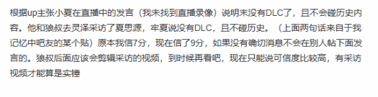 由于@中年玩家张小夏在今年5月份曾与《明末:渊虚之羽》的制作人夏思源进行了合影,且也有贴吧玩家表示@中年玩家张小夏曾在近期的直播里发言,称自己与另一位up主@狼叔说游戏采访了夏思源,夏思源称《明末:渊虚之羽》没有dlc,且不碰历史。值得一提的是,@狼叔说游戏曾发布过一期《明末:渊虚之羽》开发幕后终极揭秘的视频,因此@中年玩家张小夏的说法有着一定的可信度。当然,一切消息应以《明末:渊虚之羽》官方发布的为准,还望各位玩家理性看待。