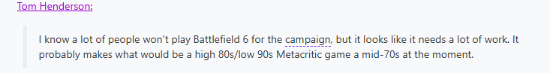 汤姆·亨德森表示:“我知道很多人不会为了战役模式去玩《战地6》,但目前看来这部分内容还需要大量改进。这可能会让原本能在metacritic(m站)上获得80多分甚至接近90分的游戏,现在只能徘徊在70分左右。”