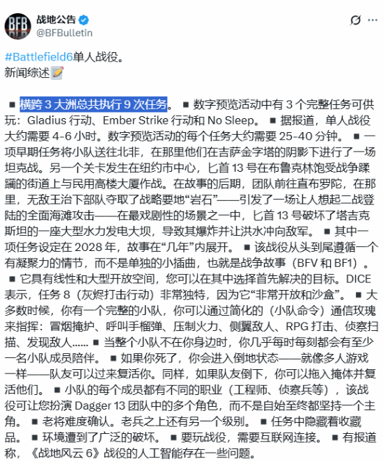他的最新帖子指出,战役共有九个任务,分布在三大洲。此外,单人战役仅需4到6小时即可通关。