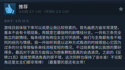 给出好评的玩家表示,本作并不是无脑跟风真人恋爱影游平庸作品,而是通过精良的制造给这个品类树立了标杆,内容非常惊艳,演员的演技也相当精彩。