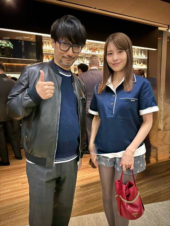 照片中,小岛秀夫身穿标志性的皮夹克与黑框眼镜,比出大拇指手势,而有村架纯则以清新装扮现身,手拎红色prada小包,看上去两人关系颇为融洽。