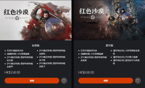 韩国开发商pearl abyss最新作品《红色沙漠》现已开放预购!本作共有标准版和豪华版两个版本,steam国区价格分别为268元和328元,ps5港服的价格分别为558hkd和638hkd。将于3月20日发售。