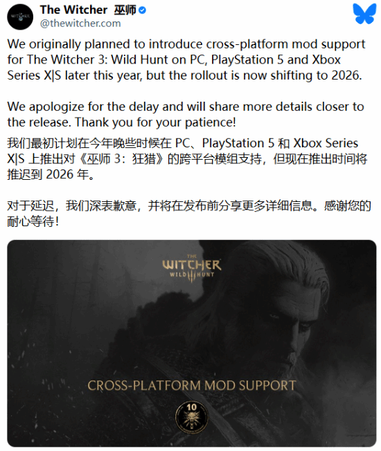 cdpr表示:“我们原计划于今年晚些时候为《巫师3:狂猎》的pc/ps5/xbox series x|s平台推出跨平台模组支持,但目前该功能已推迟至2026年上线。对于此次延期我们深表歉意,将在临近发布时分享更多细节,感谢大家的耐心等待。”